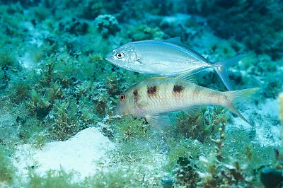 相手を隠れ蓑にして獲物に近づく・・・・、アジ?ヒメジ?