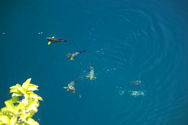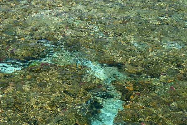 崖との間の水路は遊泳禁止だそうですが、浅いところと