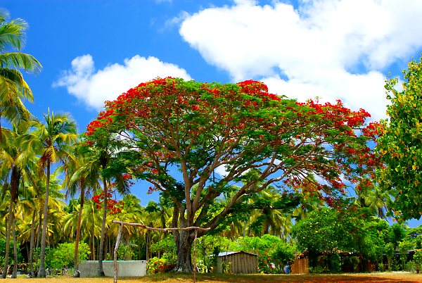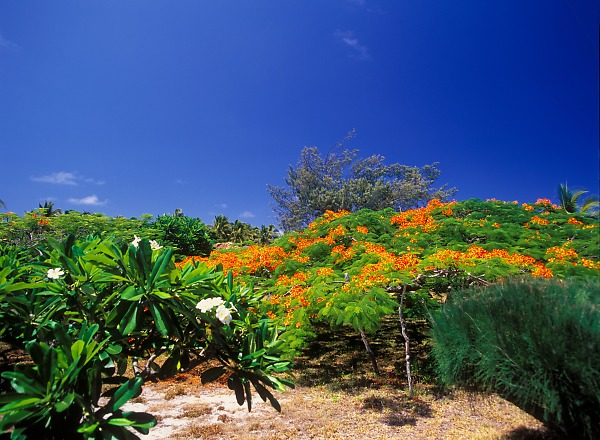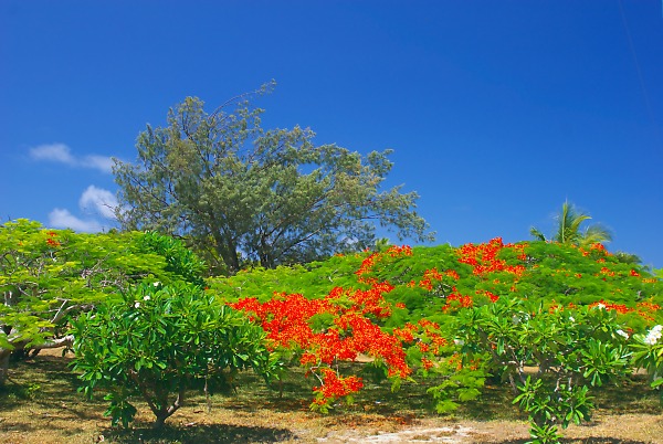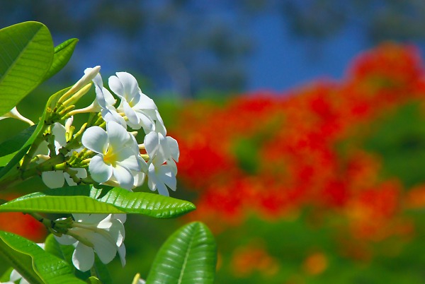 プルメリアの白が火炎樹に引き立てられて更にきれいに思えました。