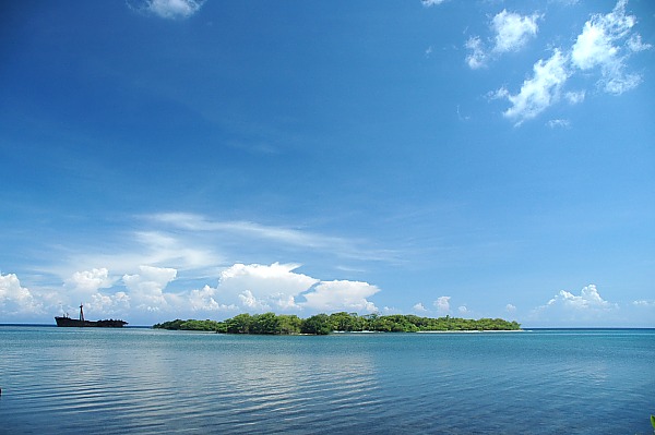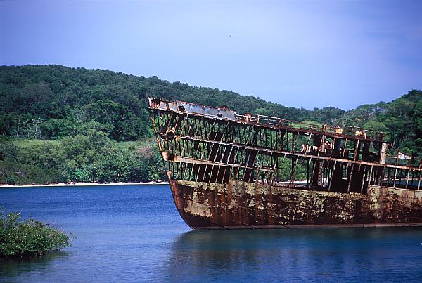 静かな湾内で船が朽ち果てていた。座礁したのだろうか。