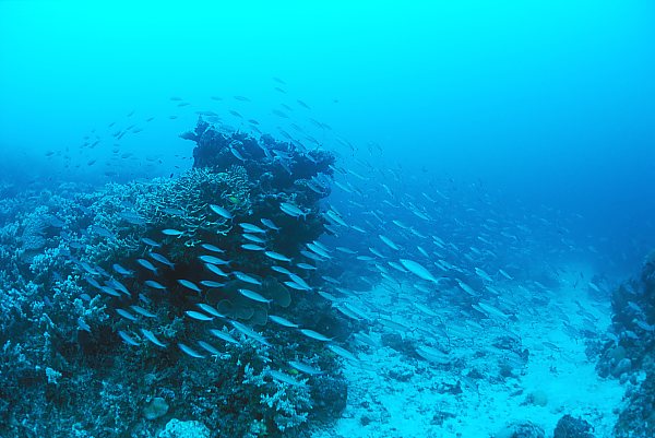 サンゴの感じ、海の色、太陽の方向、雲の量から見て、悪いコンディションの中